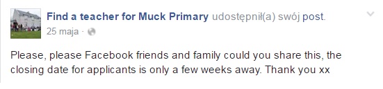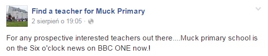 Nie dziwi więc, że otwarty w 2013 (!) roku wakat do dzisiejszego dnia nie został wypełniony. Od początku świadomi rekrutacyjnego wyzwania znalezienia nauczyciela dla swych dzieci byli rodzice na Muck. Zdawali sobie sprawę, że samo opublikowanie ogłoszenia rekrutacyjnego przez szkockie władze edukacyjne może nie wystarczyć, dlatego założyli stronę na Facebooku (oraz dobrego, regularnie prowadzonego bloga), poprzez którą – w miarę swoich skromnych możliwości – promowali swą maleńką wyspę i kluczowe dla edukacji jej najmłodszego pokolenia stanowisko.