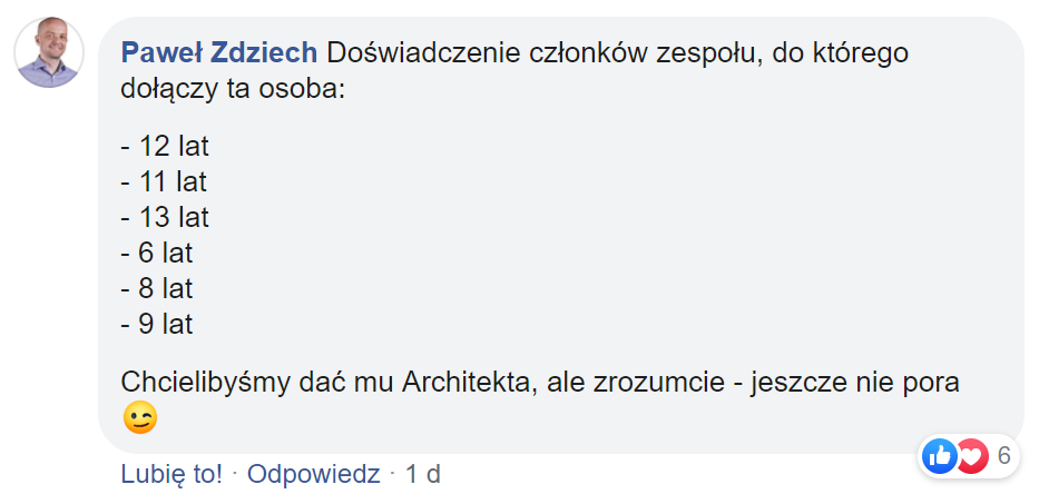 Sprawdziłem z ciekawości, kim był autor pierwszego, najbardziej popularnego komentarza pod wspomnianym na początku postem, oburzony tym, że stanowisko osoby z 3-letnim doświadczeniem można nazwać Junior.